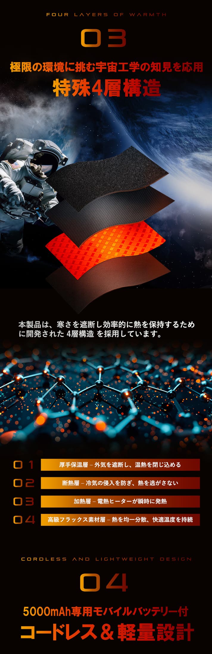 - 5000mAhバッテリー搭載!最大6時間の連続保温で冬の自由を解放【サバイバル級防寒ギア】