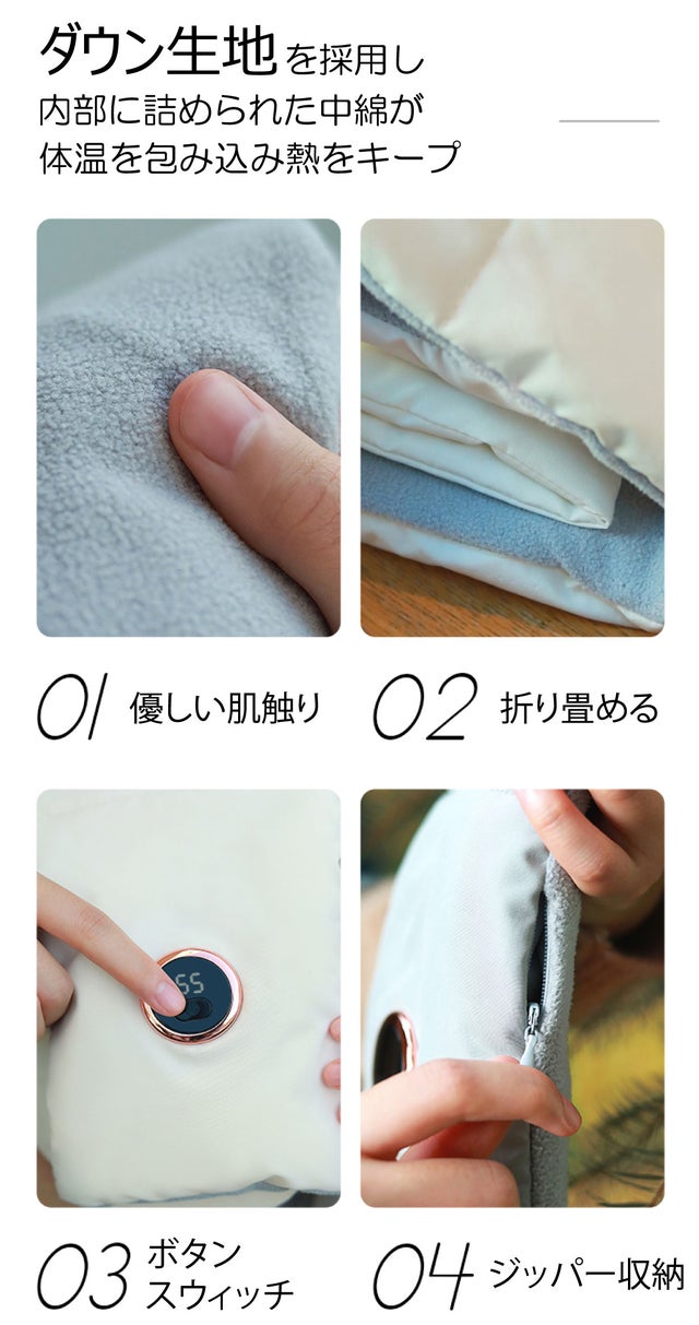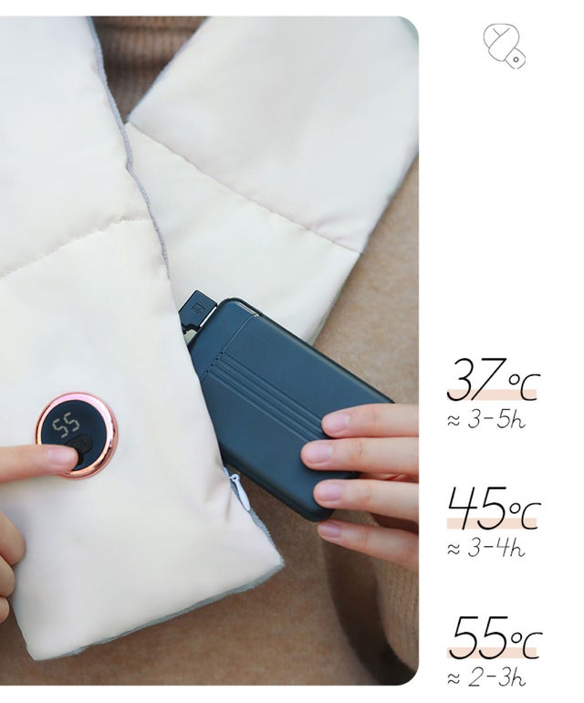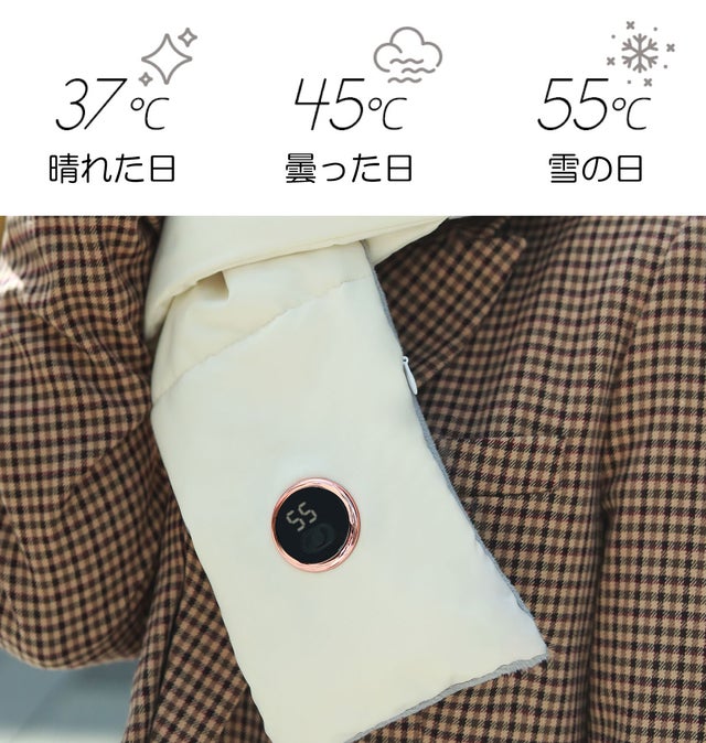 最大55度の3段階の温度調整により、いつでもどこでも首を温めます。ボタンとデジタルディスプレイを使用して、ワンタッチするだけで 必要に応じて自由に調整することができ、温度表示も一目でわかり、天気の変化に順応します。