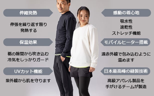 - モバイルヒーター搭載でリアルに暖かさを実感できる軽量ヒートウェア
