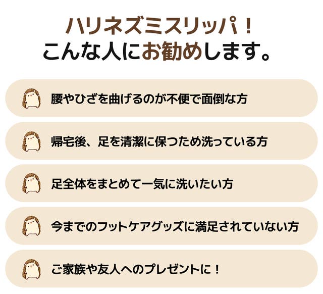 この商品を輸入しようと思った理由:ブーツを履く時期になると足の臭いがどうしても気になり、家に帰ってきたらすぐに足を洗っていました。でも腰を曲げたり手を使ったりしてもなかなか難しかったです。そこで見つけたのがハリネズミスリッパです! 多くの皆様にもっと楽に足洗いをしてもらいたい!と思い紹介することになりました。