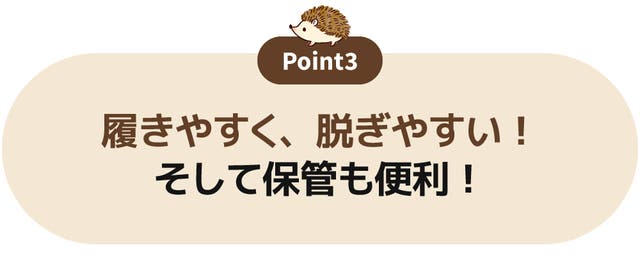 ハリネズミスリッパは通常のスリッパより広めで、履く時にも手を使わずスッと、足を入れるだけでよいのでとても楽です。