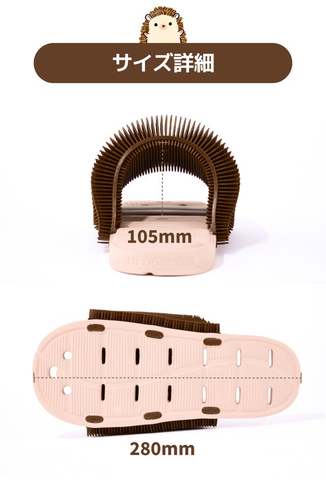 一般的なフットブラシは底面にしかブラシがついていないのに比べ、ハリネズミスリッパはアーチ形部分の上下・そして側面まですべてブラシがついています。