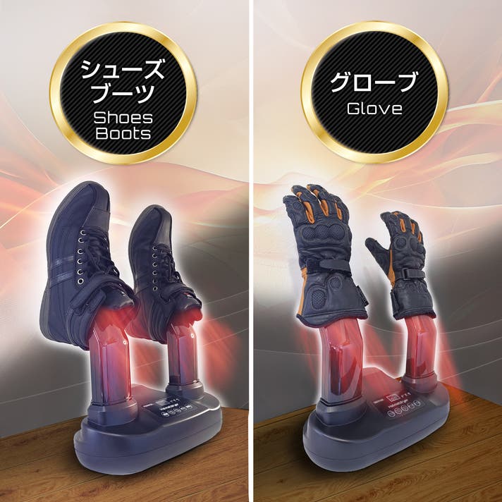 グローブ・ブーツ用アタッチメントは、シューズ・ブーツ・グローブの消臭&乾燥に最適です。バイク用の重量のあるシューズでも倒れにくい本体設計です。