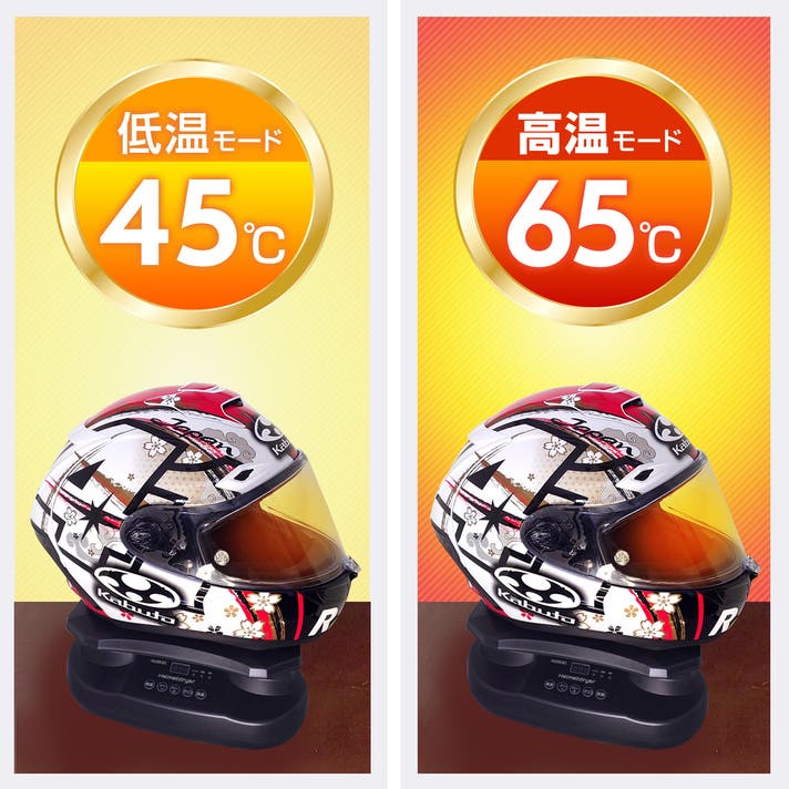 ヘルメットの状態や素材に応じて、高温モードで素早く乾燥、低温モードで優しく乾燥など、温度を使い分けた乾燥が可能です。