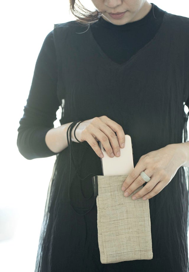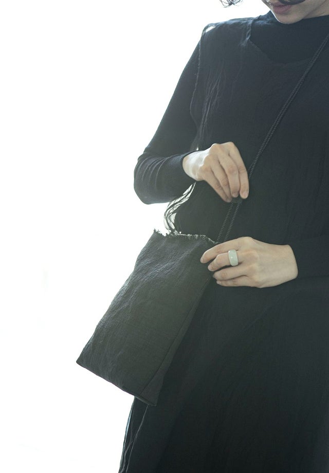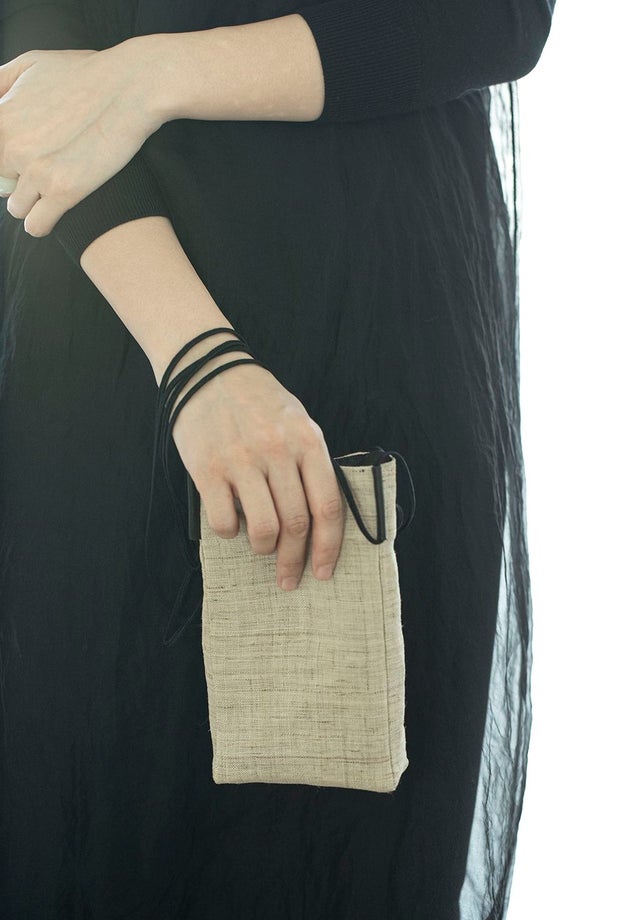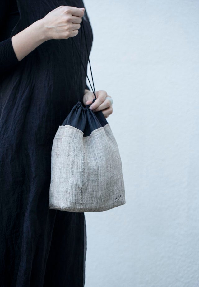 表地 : hemp 100% / 裏地 : cotton 100% / 紐 : polyester 100% / リング : leather 100%