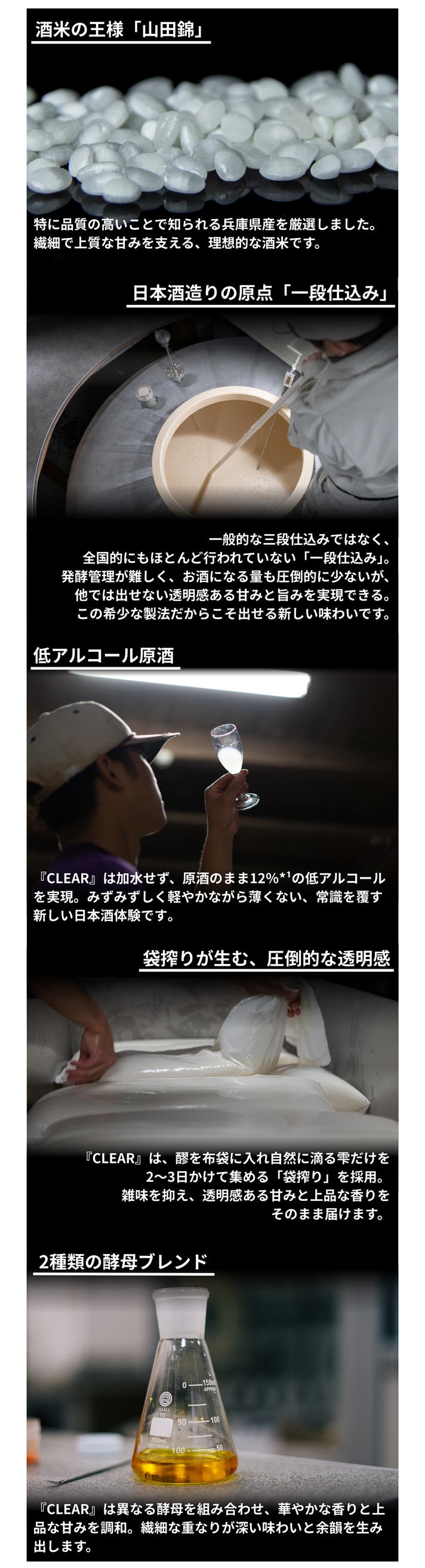 また、『CLEAR』という商品名は、「馴染みのない方にはわかりづらい」、「日本酒って飲みづらい」等の日本酒業界が抱えている敷居の高さを少しずつ“クリア”にしていく、問いかけでもあります。