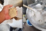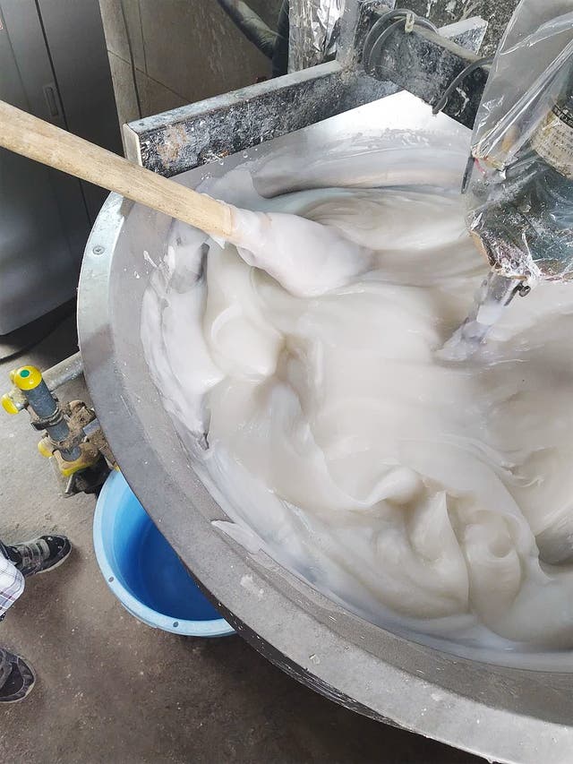 蒸して澱粉糊(でんぷんのり)を作ります。