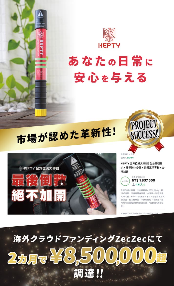 リターン品の発送が完了するまで、IyasakaGoはHepty消火ツールの日本における独占販売権を有する正規代理店です。詳細に関しては、ページ下部のリスク&チャレンジをご確認ください。