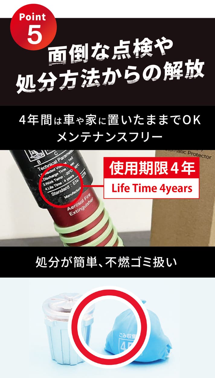 A. 定期点検や詰め替えは不要で、最大4年間そのまま備えておくことが可能です。