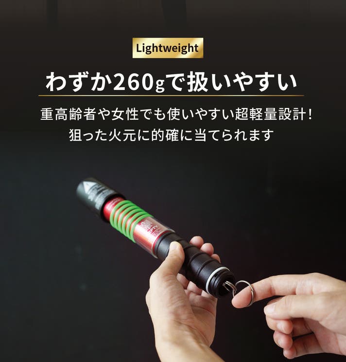 - 【スマホより軽い260g】いざという時、力の弱い家族も瞬時に使える。初期消火が可能なツール