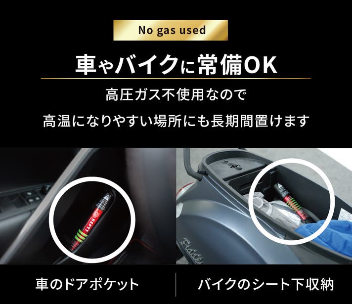 加圧ガスを使用しない無圧構造のため、夏場の車内やアウトドアシーンでも安心して携帯できます。