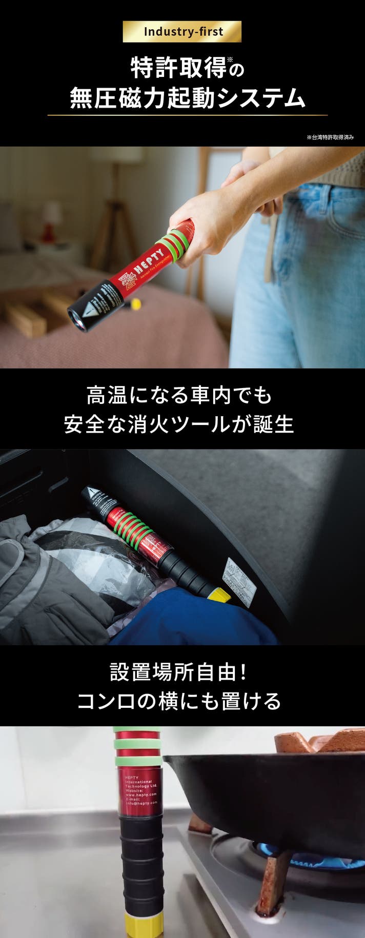 HEPTYは従来の高圧ガス消火器の危険性を根本から解決する「無圧磁力起動システム」を開発。