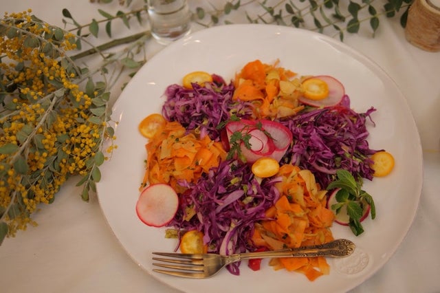 人参や紫キャベツを千切りにし、塩もみしたあと