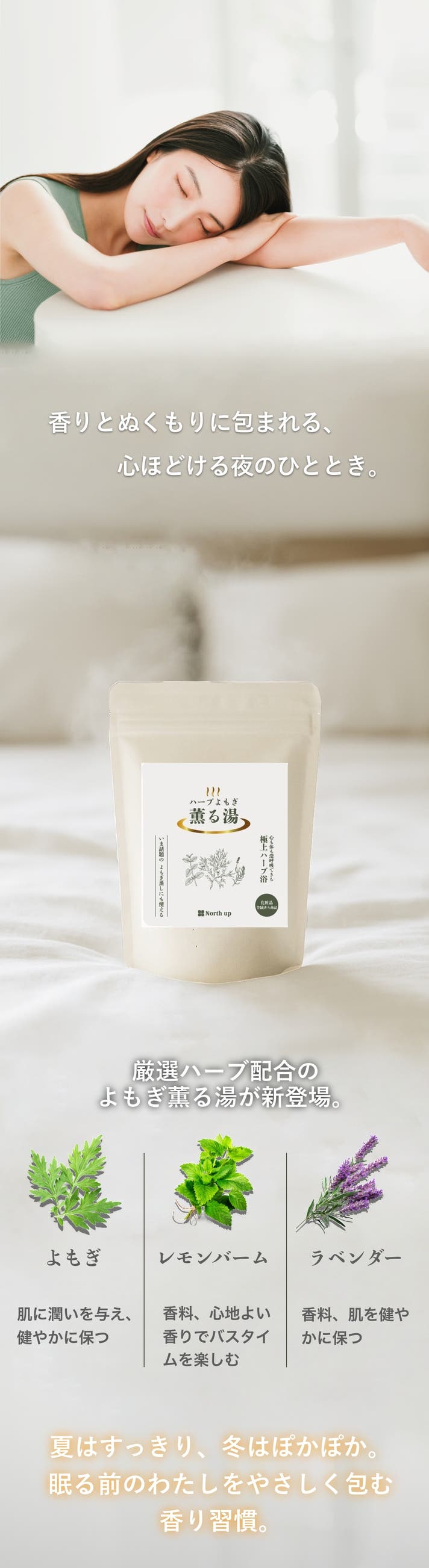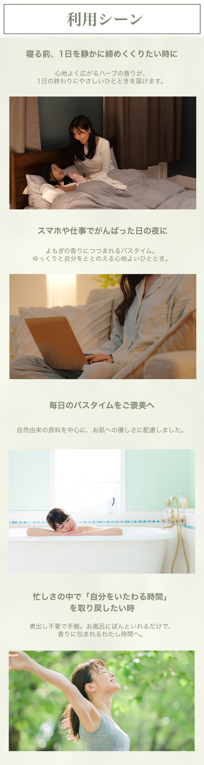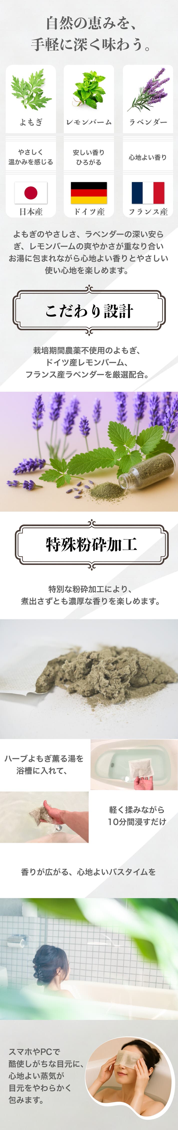 - 天然ハーブの香りが広がり、肌と心を優しく包み込む贅沢な癒しのバスタイム