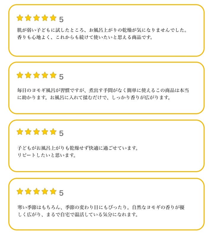 ※こちらは、既に販売中の「よもぎ入浴化粧品」に関するレビューです。新たにMakuakeでご紹介する商品とは異なりますが、よもぎの香りや効果についての参考としてぜひご覧ください。