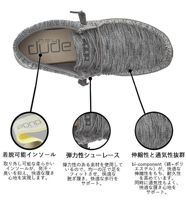 HEY DUDEの履き心地を実現しているインソール。取り外しも簡単で、超軽量・通気性・柔軟性が抜群な形状記憶素材で出来ています。