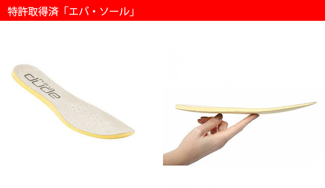 従来の靴のスタイルから離れ、金属部品を使わず、独自の特許取得済の「エバソール」と、軽量で耐摩耗素材で構成されており、気軽に履けて、タフに履ける、履き心地抜群の靴が生まれました。