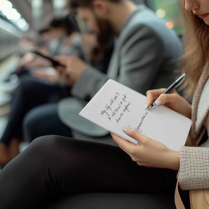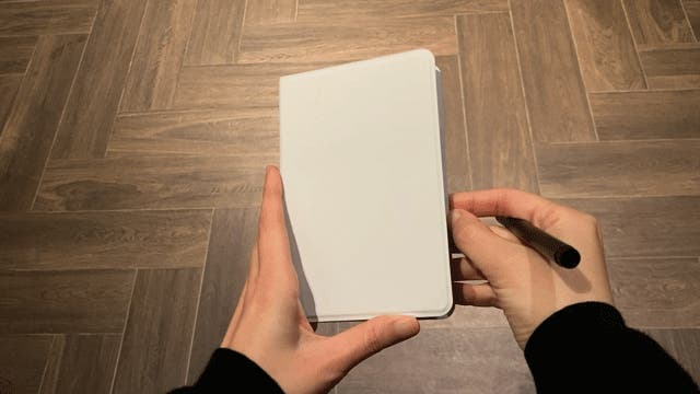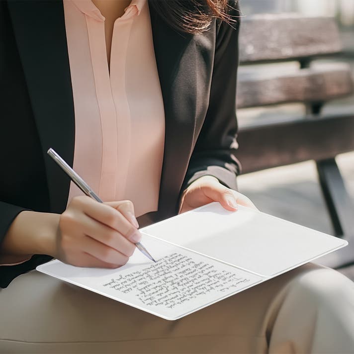 持ち歩き特化:折りたたむとスマホ程度のコンパクトさ。ポケットや小バッグにも収まるので、外出先や移動中のアイデアメモに最適。会話中に浮かんだキーワード、買い物リスト、現場での寸法メモなど、立ったままでもサッと書ける。
