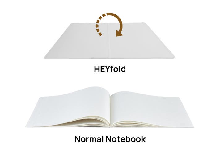 通常のかさばるノートとは異なり、HEYfold は独自のシームレス折りたたみ設計。ページが平らに開き、手首にも優しい快適な筆記面を実現。