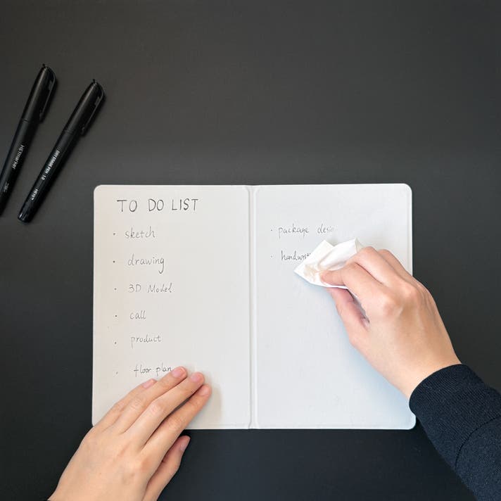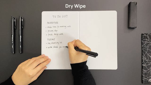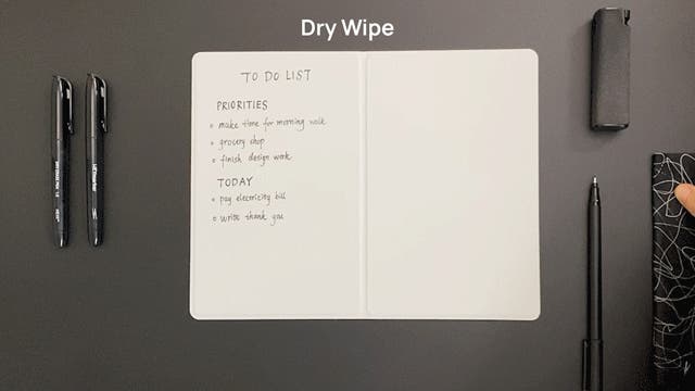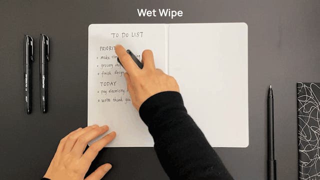 HEYfoldは、書くだけでなく“消す”体験も革新的。その場で消す「ドライワイプ」、しっかり消す「ウェットワイプ」。乾拭きならサッと手軽に、濡れ拭きならしっかりクリアに。ホワイトボードのような汚れ残りやカスの心配もありません。