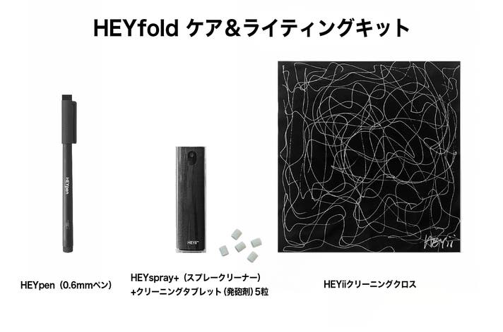 「ケア アンド ライティングキット」は、HEYfoldを快適に使い続けるための専用メンテナンスセットです。ベーシックパックには含まれない、EYiiクリーニングクロス(細かな汚れや指紋もやさしくオフ)クリーニングタブレット(発泡剤:頑固なインク汚れもスッキリ落とす特別処方)の特別アイテムが含まれます。あなたのHEYfoldを常にクリアで美しい状態に保ちます。