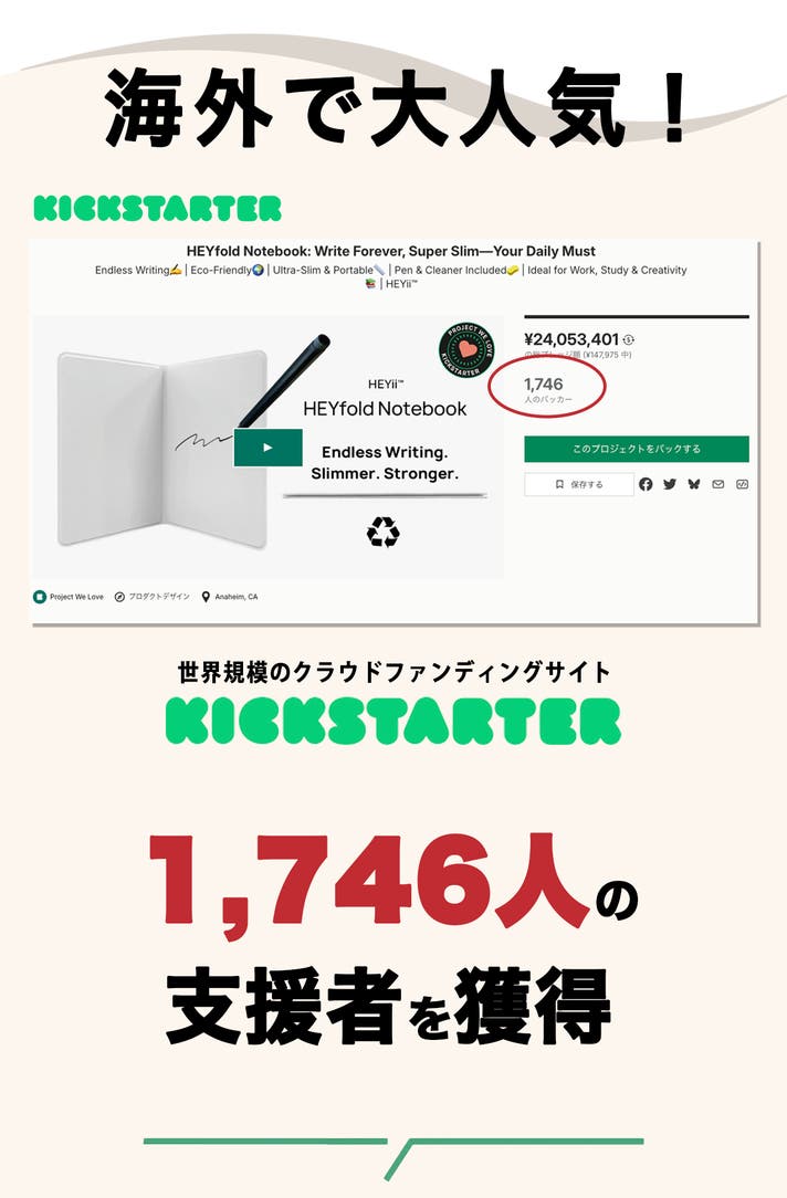 HEYfoldは、世界規模のクラウドファンディングサイト「Kickstarter」で公開され、1,746人の支援者から約2,400万円の支援金を獲得しました。