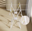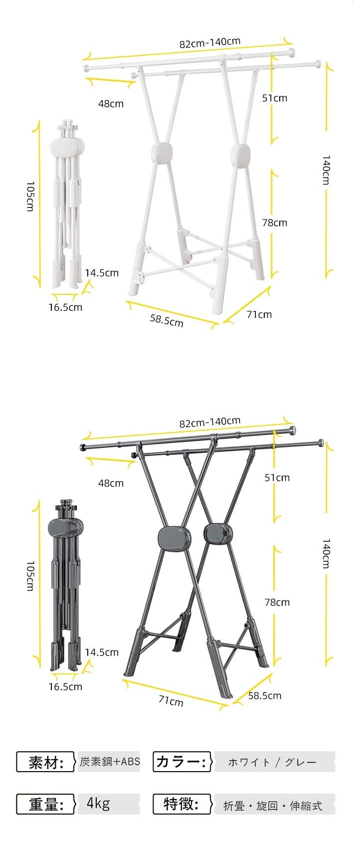 1.4mの高位置設計により、ロングスカートやワンピースも床につかずシワになりにくい仕様。さらに、布団やシーツも広々と干せて風通し抜群!衣類から寝具まで快適に乾燥できる便利なデザインです。