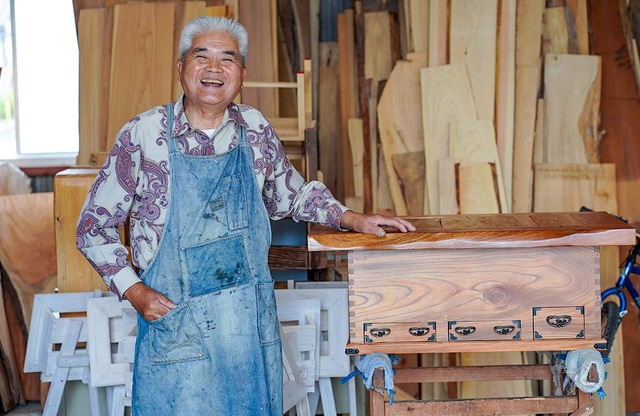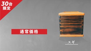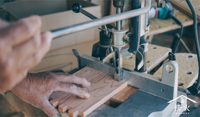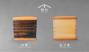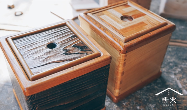 杉は焼きをいれ、黒がきれいに出るように仕上げています。檜は、木目を活かしシンプルな作りにし、蓋部分に寄木造のあしらいをしています。