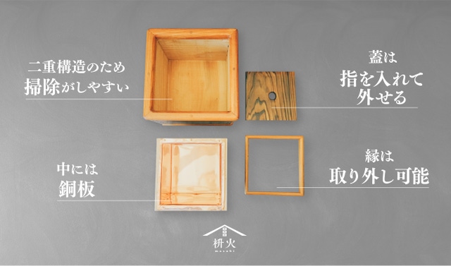 火鉢本来の形と同じように二層構造になっているため、取り外しがしやすく、掃除も簡易です。内側の木材には銅板を仕込んでいるため、木材に火が回らないようになっております。七輪のように使用できるような取り回しの良いサイズに仕上げています。通常七輪は珪藻土などを使用しますが、木材で七輪としても使用できる商品は珍しいです。