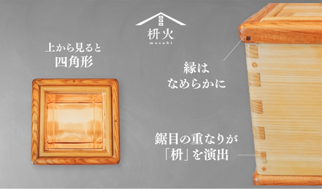 蓋と底の部分はサイズ違いの正方形を合わせ、火鉢の特徴を表しています。