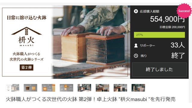 過去に制作した卓上火鉢 “ 六火 Rocca ”、“ 枡火 masubi ”はともに、皆様から多大なる応援をいただき、プロジェクトの開始直後に目標を達成することができました。