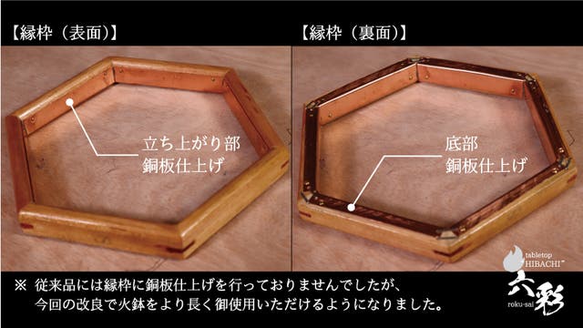 この仕上げによって、従来品と比較して「縁枠」の耐久性が飛躍的に向上したため、より長い期間、火鉢を御使用いただけます。