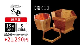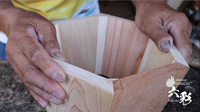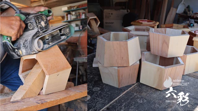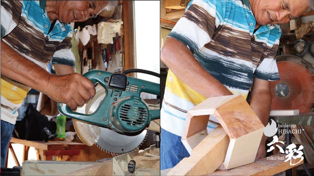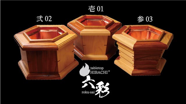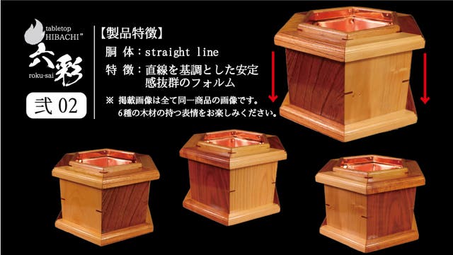 今回、卓上火鉢シリーズの第3弾として製作した “ 六彩 rokusai ” は個性豊かな6種の国産木材(サクラ・ヒノキ・ケヤキ・カヤ・センダン・イチョウ)を贅沢に使用しており、それぞれの木材の持つ “ 多彩 ” な表情をお楽しみいただける火鉢です。