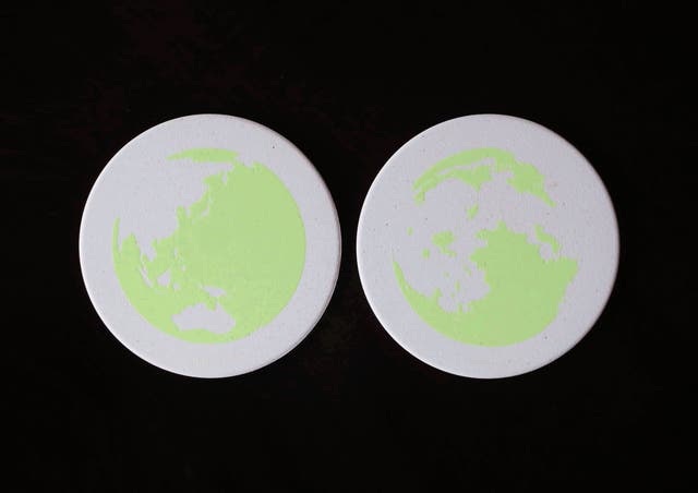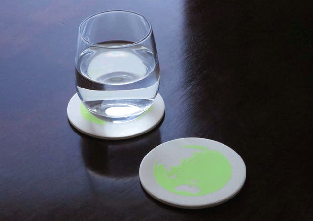 地球をモチーフにしたコースターは、大地を珪藻土で表現し、海を蓄光で表現しています。夜になると蓄光素材が淡い光を放ち、まるで宇宙から地球を見下ろしたような静かな輝きを楽しむことができます。光が消えかける様子も地球の夜明けを思わせ、使うたびに地球への愛着を感じるデザインです。