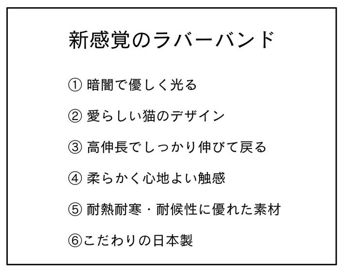 - 猫デザインの蓄光ラバーバンドが新登場。見た目の可愛さと実用性を兼ね備える。