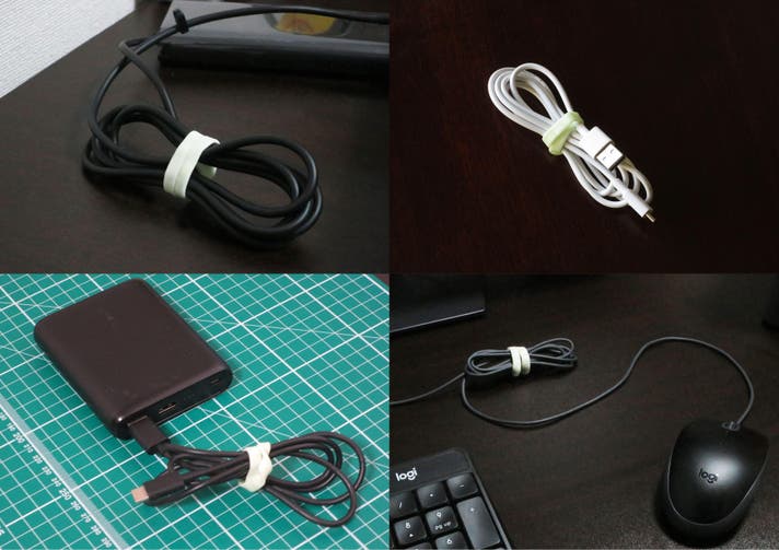 ラバーバンドとしてケーブルやペンなど色々なものを束ねることで、簡単に整理整頓ができます。ラバーバンド自体が優しく光るので目印になり、暗い場所で見つけやすくなります。見た目もおしゃれで収納しやすくなります。