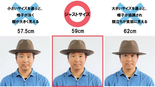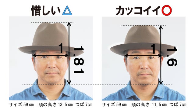 帽子の頭の高さは『面長は低いタイプ・丸顔は高いタイプ』など、黄金比の1:1.6になるように選ぶとバランスよく仕上がります。