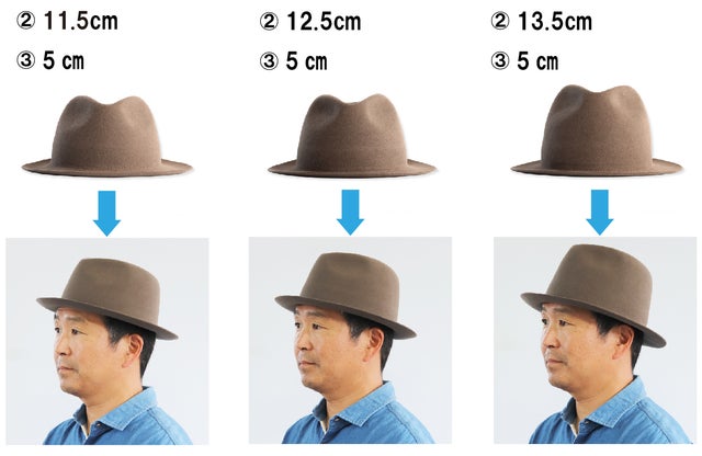 そこで帽子の頭の高さを11.5cm・12.5cm・13.5cmの3サイズご用意しました。