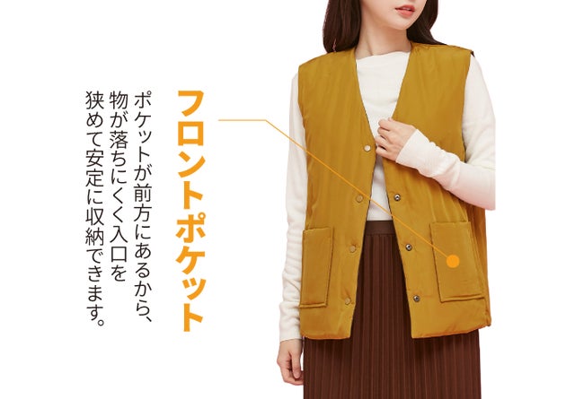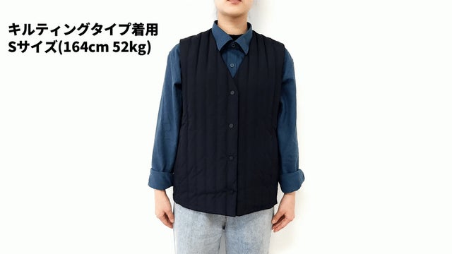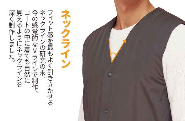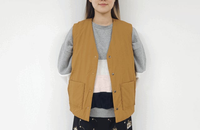 アウターの中にレイヤードしても着るベストなので邪魔にならない厚さ。どんな服ともマッチできます。