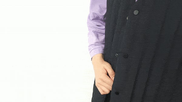 パターンタイプを着た時は裏側のポケットを内ポケットのように使用できます。