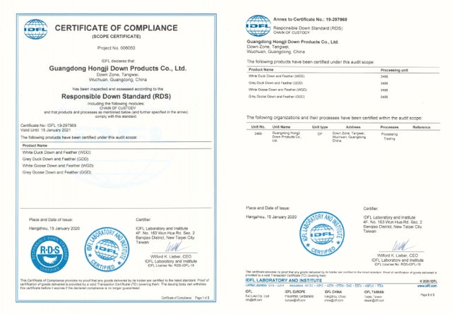 RDSとはResponsibleDownStandardの略で、 ガチョウやカモの飼育や屠畜、毛の採取までのすべての過程で、安定性や動物虐待の有無など倫理的な正当性を証明する認証です。