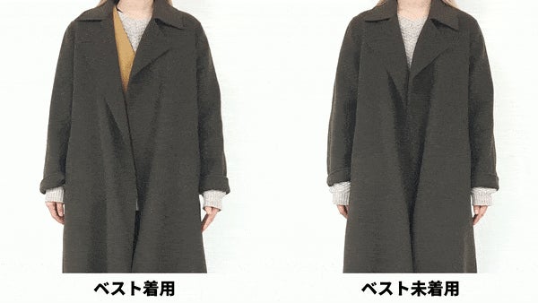 ただし、アームホールが深く幅の広いデザインなのでコートの中にレイヤードして着ることが多いなら、普段のサイズより一段階小さいサイズ、