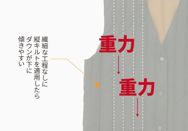 縦キルトラインが綺麗でおしゃれにもかかわらず、多くのグースダウンが横キルティングで製作されている理由は、