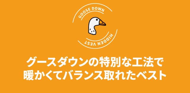 『HIDDEN VEST』はグースダウン(胸元の産毛)75%とフェザー(首元の羽毛)25%の割合で制作されています。