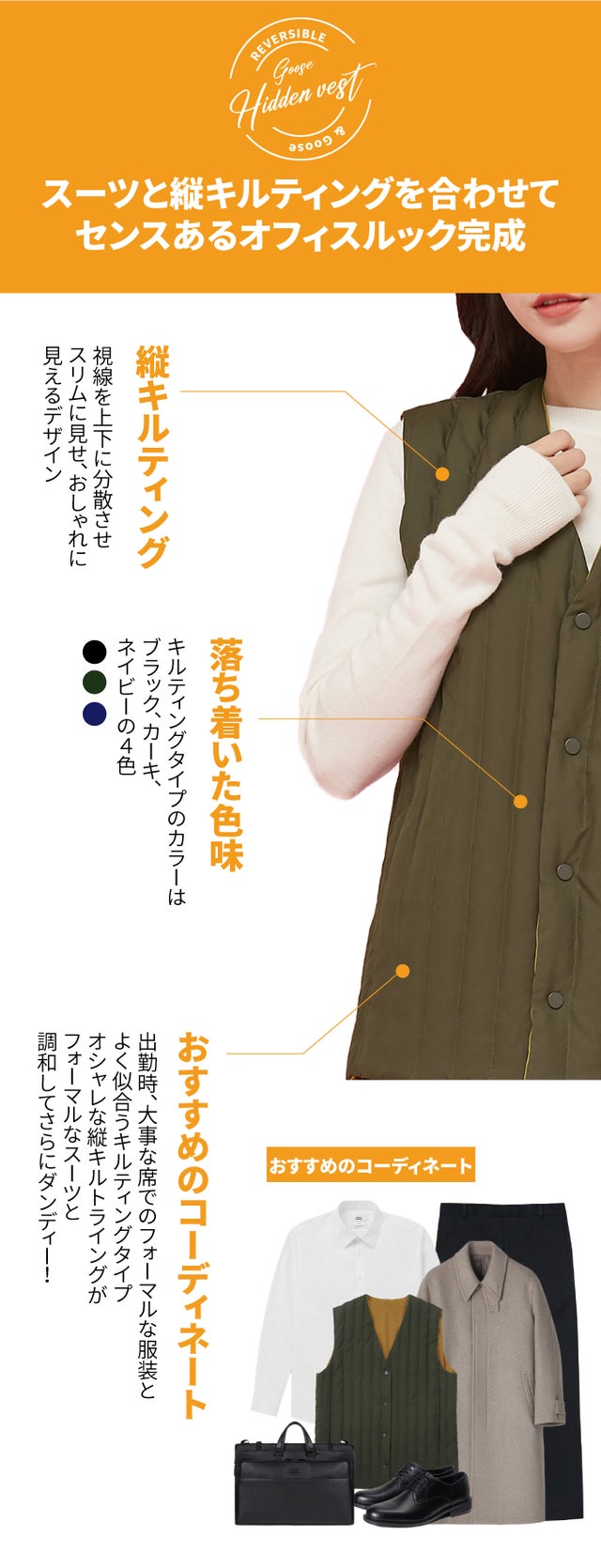 フォーマルなスーツやオフィスルックとコーディネートしても合うオシャレなキルティングタイプ!