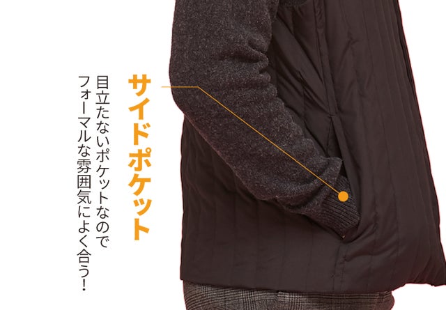 財布、携帯電話などの物をポケットにきれいに保管できるため、 スーツの外観からポケットに入っている物が見えず、ボリューム感も分からないので、よりダンディーです。