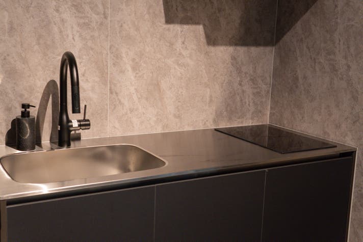 シックなトーンのミニキッチンには、2口IHコンロを完備。簡単な食事なら、お客様自身でお作りいただけます。