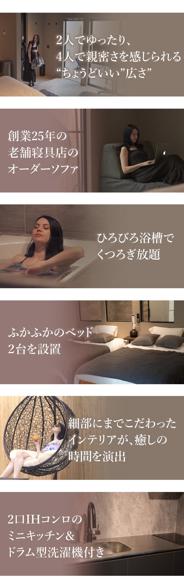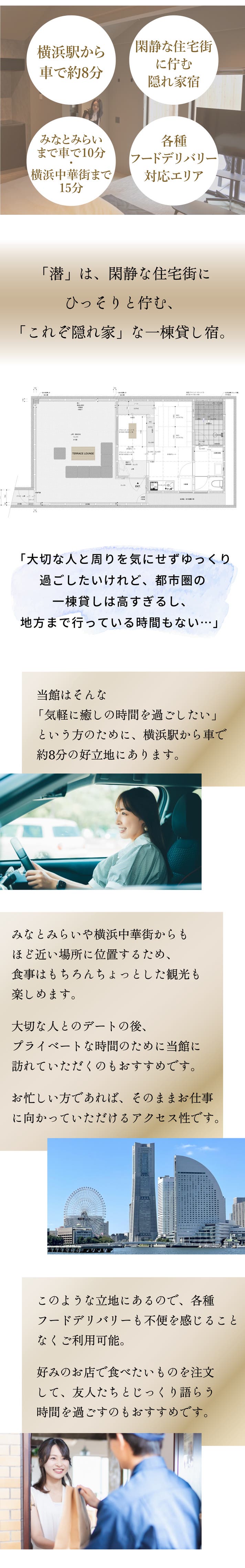 プライベートな空間でゆったり過ごしたいという方はもちろん大切な友人やパートナーとプチ旅行を楽しみたいという方など、潜という場所で、思い思いの時間を過ごしていただければ、こんなに嬉しいことはありません。