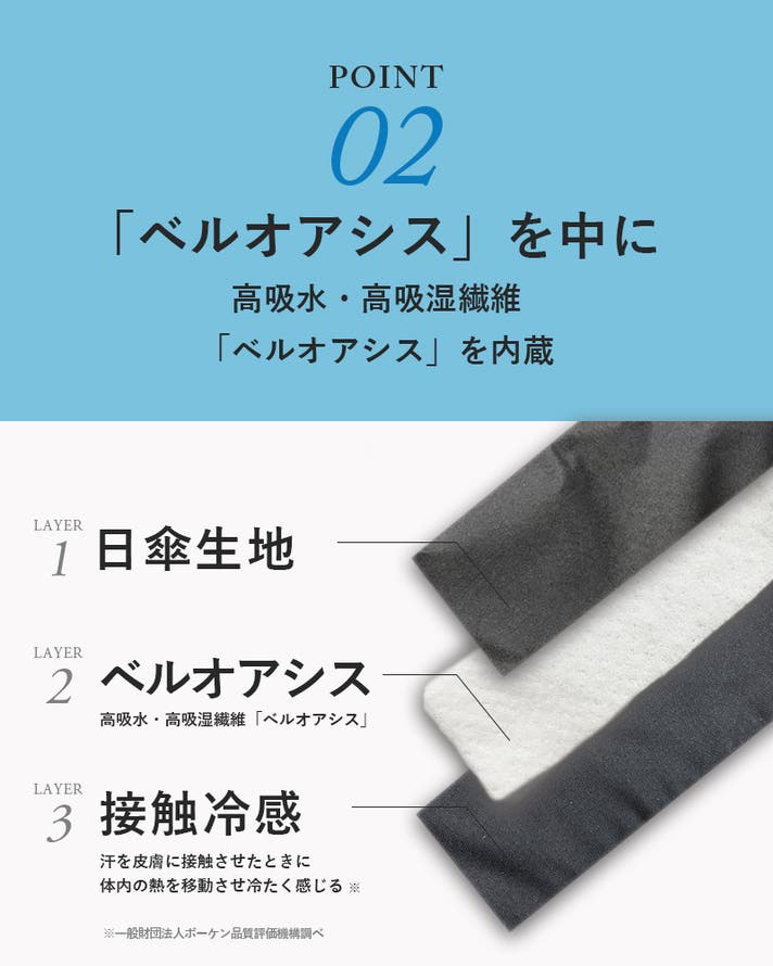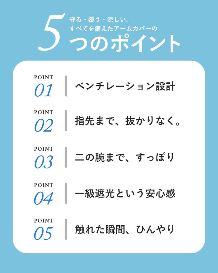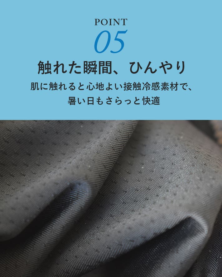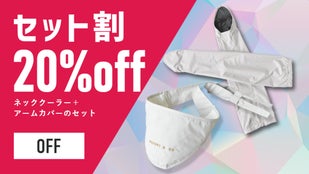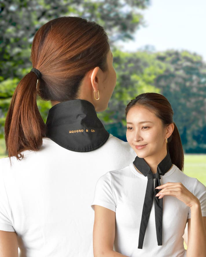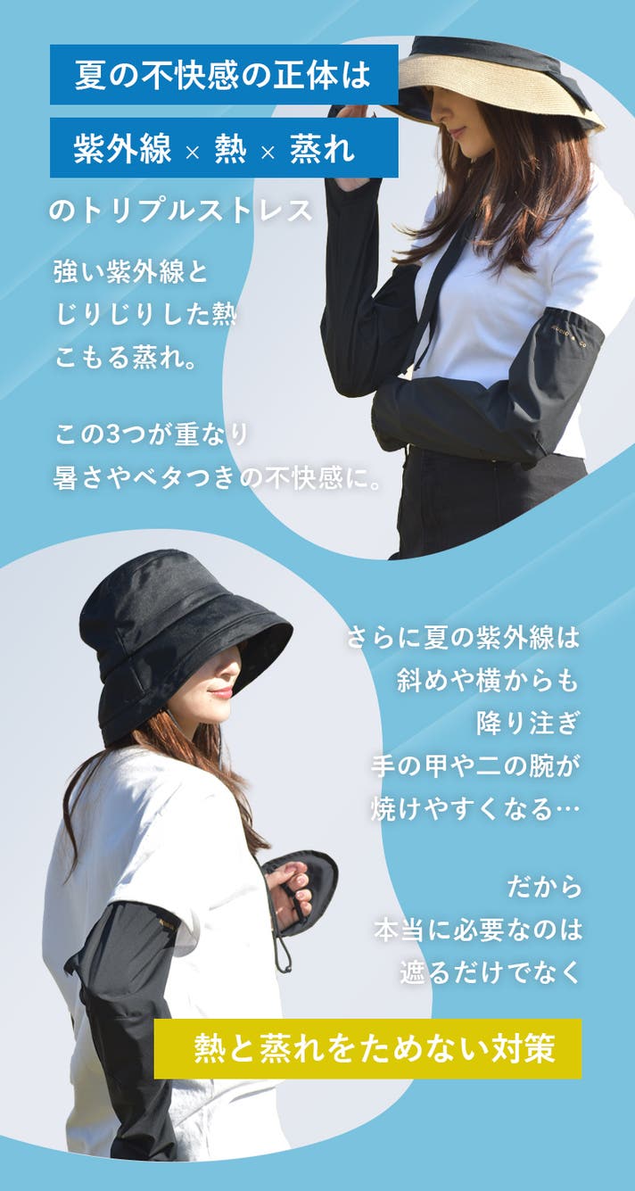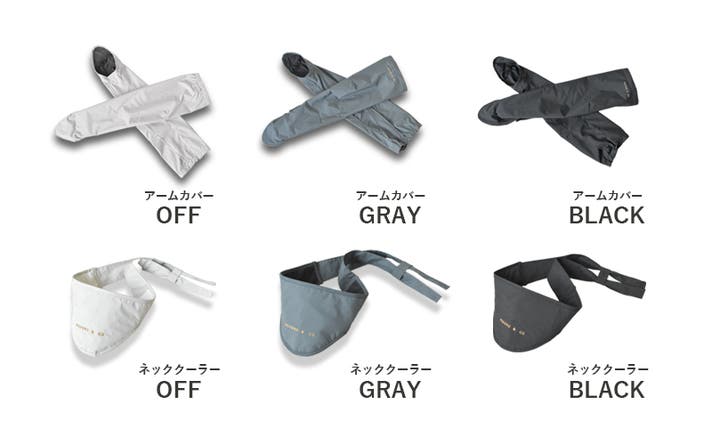 - 遮光生地と接触冷感素材を使い、首元と腕を同時にカバーできる組み合わせ設計