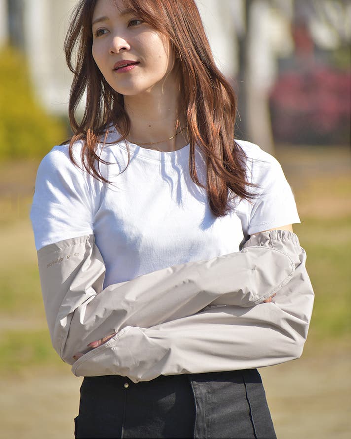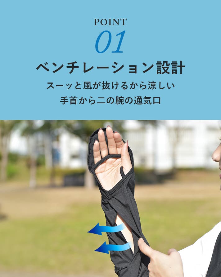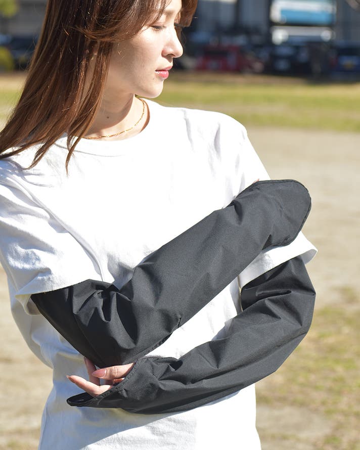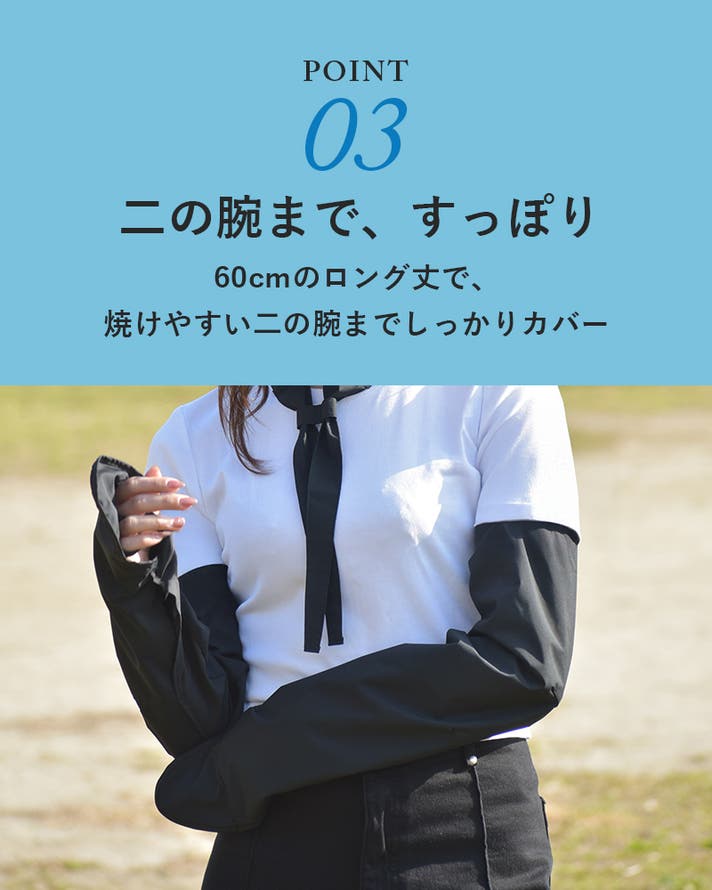 60cmのロング丈設計で、日差しを受けやすい二の腕までしっかりカバー。腕を上げ下げしても隙間ができにくく、動いている間も紫外線対策を続けられます。半袖でも肌の露出を抑えやすく、外出や運転、屋外作業など幅広いシーンで安心して使える長さです。